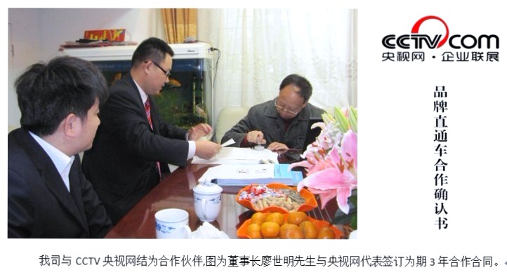 2012年4月8日,我司与CCTV央视网结为合作伙伴,图为董事长廖世明先生与央视网代表签订为期3年合作合同。